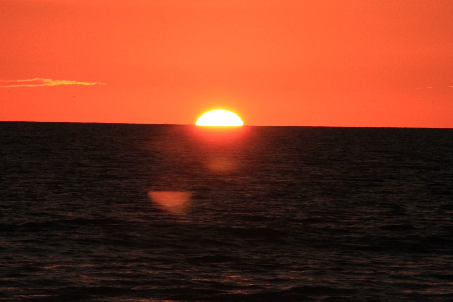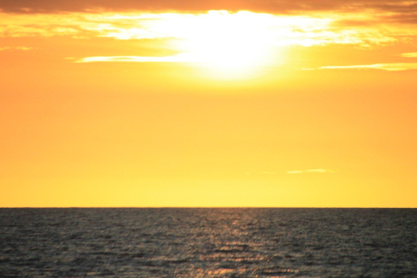 やがて夕陽は水平線の波のかなたにゆっくりゆっくりと身を沈めていくのですが、沈み込む直前に「グリーンフラッシュ」を見ることができます。